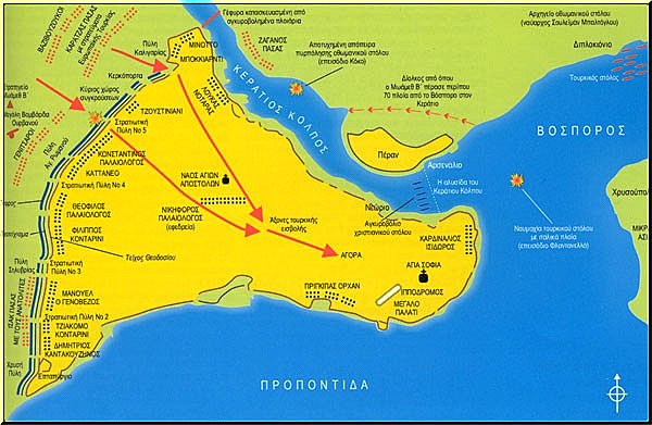 Λίγο μετά, όπως μαρτυρεί ο Λεονάρδος, και ο Κωνσταντίνος έπεσε μαχόμενος στην Πύλη του Αγίου Ρωμανού, αφού «κατερρίφθη χαμαί υπό γενίτσαρου, ανηγέρθη και έπειτα επλήγη εκ νέου θανασίμως πλέον»16.