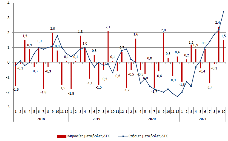 Ο ΕνΔΤΚ κατά τον μήνα Οκτώβριο 2021, σε σύγκριση με τον Σεπτέμβριο 2021, παρουσίασε αύξηση 1,1% έναντι αύξησης 0,2% που σημειώθηκε κατά την αντίστοιχη σύγκριση του προηγούμενου έτους.