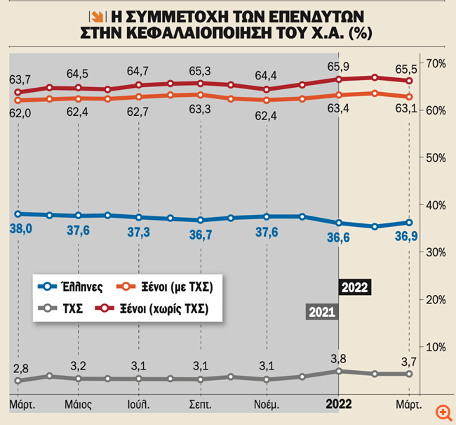 Η συμμετοχή των ξένων επενδυτών στη συνολική κεφαλαιοποίηση της ελληνικής αγοράς τον Μάρτιο ανήλθε στο 63,07%, έναντι 63,86% στις 28 Φεβρουαρίου 2022, καταγράφοντας μείωση 79 μ.β. Μη συμπεριλαμβανομένης της συμμετοχής του ΤΧΣ (2,14 δισ. ευρώ ή 3,69%) στη συνολική κεφαλαιοποίηση της ελληνικής αγοράς, η συμμετοχή των ξένων επενδυτών ανήλθε σε 65,49%. Η κεφαλαιοποίηση του Χ.Α. στις 31/3/2022 υπολογίστηκε στα 58,1 δισ. ευρώ, έναντι 58,6 δισ. ευρώ τον προηγούμενο μήνα, ήτοι συρρίκνωση 0,9%.