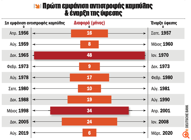 Σε όλες τις υφέσεις έχει προηγηθεί αντιστροφή της καμπύλης απόδοσης.