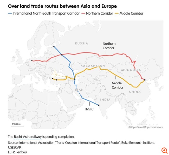 Παρά το γεγονός ότι η ΕΕ θέλει να αναπτύξει τον Μέσαίο Διάδρομο ακριβώς για να αποφύγει τη Ρωσία, μπορεί να καταλήξει να βοηθήσει έμμεσα τη διεθνή συνδεσιμότητα της Ρωσίας.