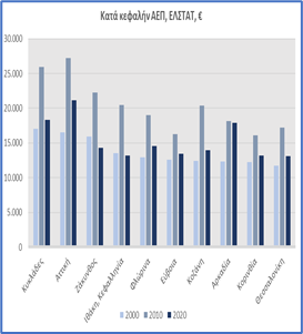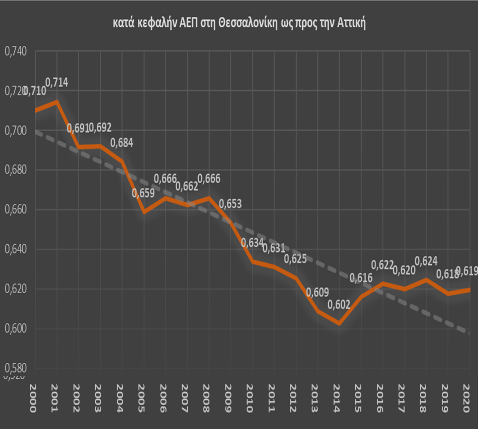 Καταρχάς, το κατά κεφαλήν ΑΕΠ στη Θεσσαλονίκη όχι μόνο είναι πλέον στο 60% της Αττικής αλλά και μειώνεται συνεχώς. Ακόμη χειρότερα, είναι ακριβώς στις περιόδους ανάπτυξης όπου η μεν Αττική κερδίζει η δε Θεσσαλονίκη χάνει. Τελικό αποτέλεσμα; σήμερα ο νομός Θεσσαλονίκης δεν είναι ο κάποτε δεύτερος αλλά πλέον ο ΕΝΑΤΟΣ στο κατά κεφαλήν ΑΕΠ στη χώρα.