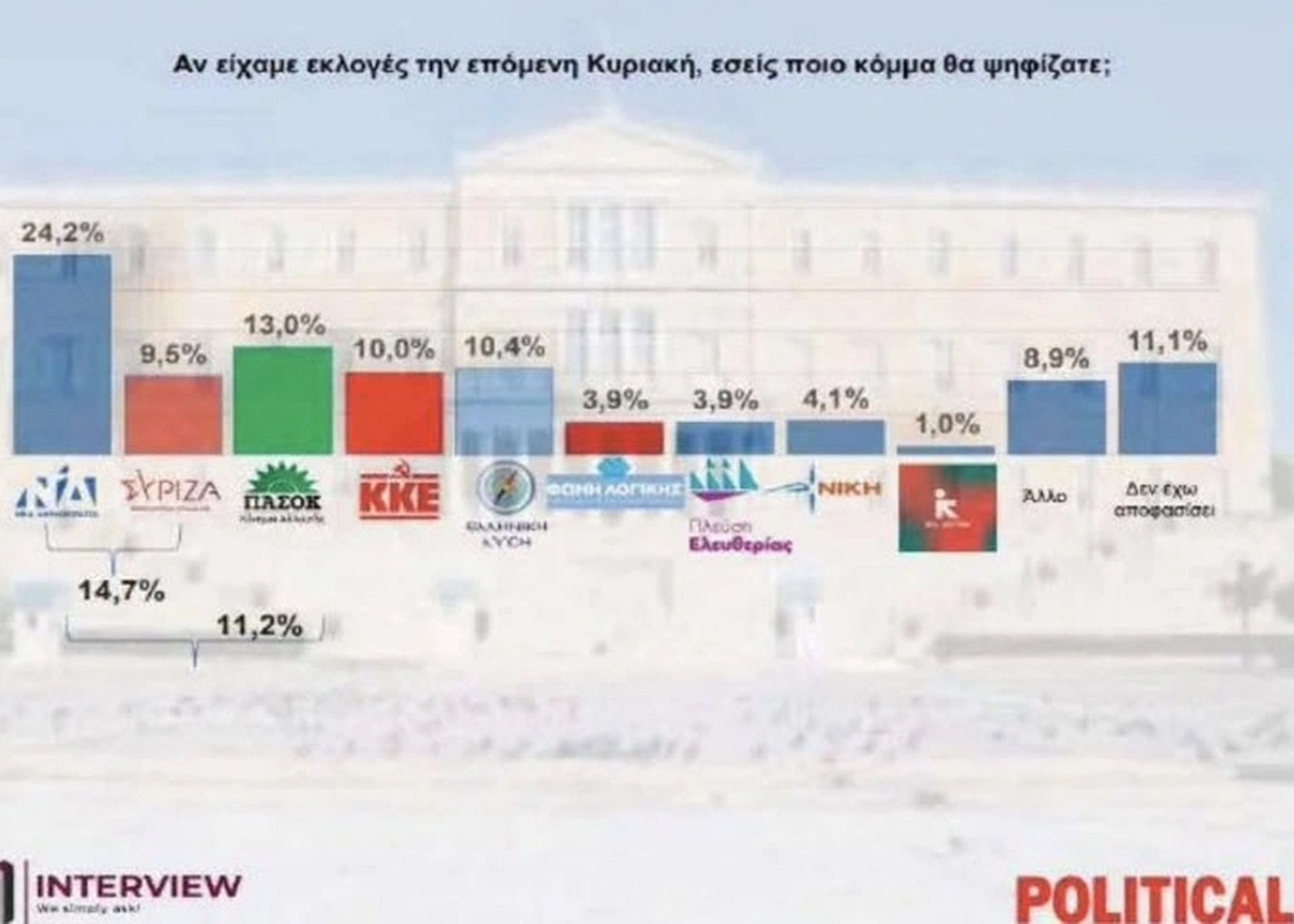 Η νέα δημοσκόπηση της Interview δείχνει πρώτη τη ΝΔ αλλά με απώλειες, δεύτερο το ΠΑΣΟΚ, ενώ ο ΣΥΡΙΖΑ είναι πέμπτος, πίσω κι από το ΚΚΕ.