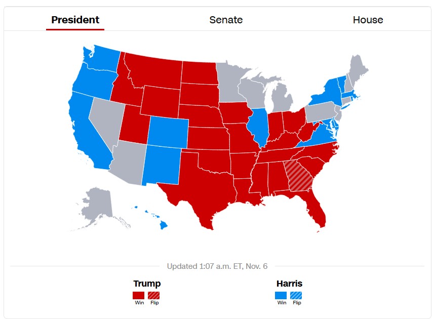 Ο χάρτης με τις πολιτείες στις ΗΠΑ όπως έχει διαμορφωθεί με τα μέχρι στιγμής αποτελέσματα. Με κόκκινο είναι οι πολιτείες όπου ο Τραμπ βγαίνει νικητής και με μπλε η Χάρις. Για τις «γκρι» πολιτείες δεν υπάρχει ακόμη αποτέλεσμα – Ώρα 08.00 © CNNΝίκη των Ρεπουμπλικάνων στη Γερουσία